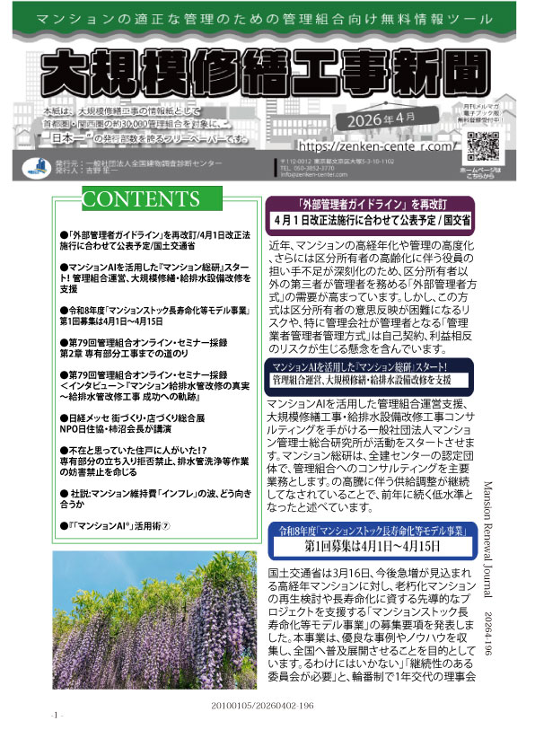 一般社団法人全国建物調査診断センターは、創立15年目を迎え、月刊大規模修繕工事新聞(2024年5月で173号)の発行、隔月で管理組合オンラインセミナー(2024年4月で通算68回)を開催、全建文庫の発行(2024年4月で45巻発行済)など、大規模修繕やマンション管理組合運営に関するさまざまな情報を提供してきました。おかげさまで、その情報量や質において他の追従を許さないレベルにあると自負しています。この業界をとりまく様々な問題もなお増加しています。そこで、当センターとしては、より質の高い情報提供にレベルアップすべく、スタッフの増強等を行っているところです。その一助として、2023年5月から一部情報の有料化をすることになりました。皆様におかれましては、今般の諸事情を理解いただき、アーカイブ視聴・閲覧データの有料化にご理解いただけますよう、よろしくお願いいたします。