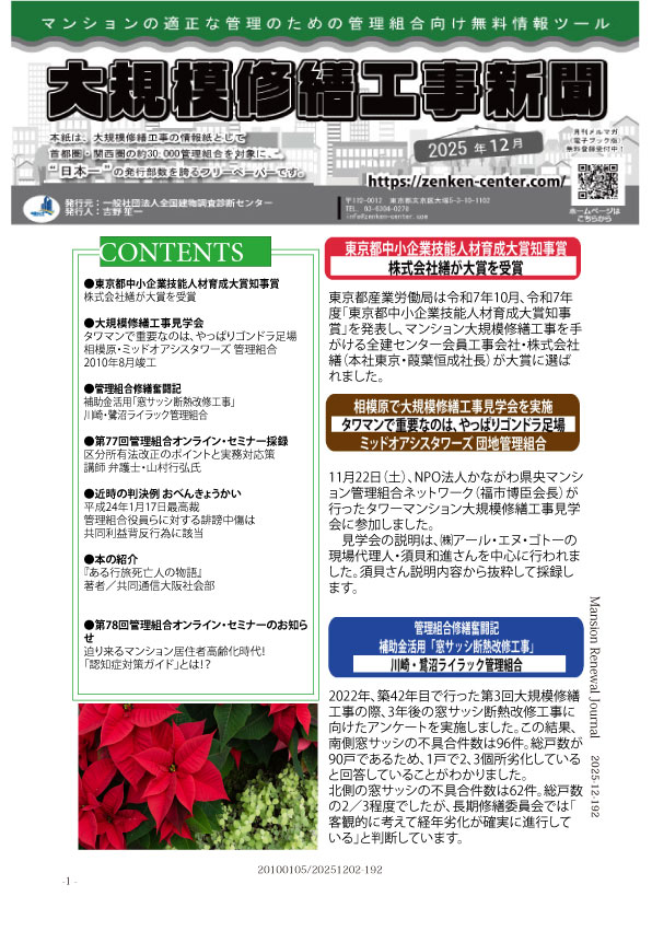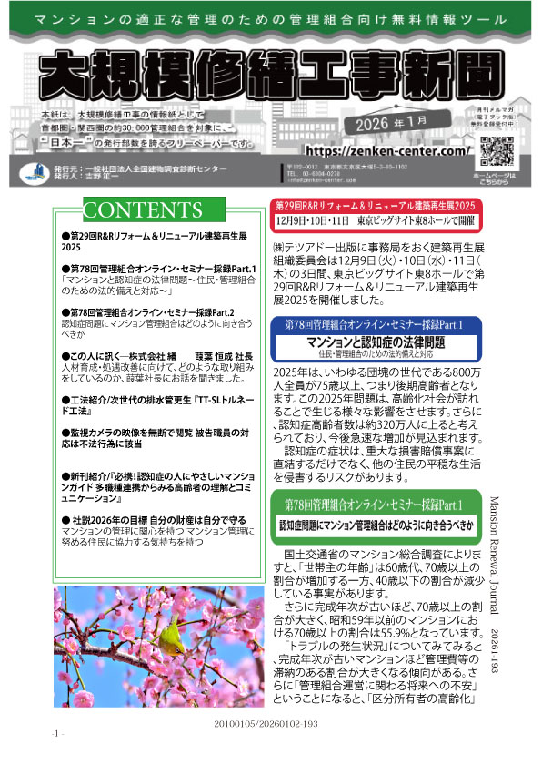 一般社団法人全国建物調査診断センターは、創立15年目を迎え、月刊大規模修繕工事新聞(2024年5月で173号)の発行、隔月で管理組合オンラインセミナー(2024年4月で通算68回)を開催、全建文庫の発行(2024年4月で45巻発行済)など、大規模修繕やマンション管理組合運営に関するさまざまな情報を提供してきました。おかげさまで、その情報量や質において他の追従を許さないレベルにあると自負しています。この業界をとりまく様々な問題もなお増加しています。そこで、当センターとしては、より質の高い情報提供にレベルアップすべく、スタッフの増強等を行っているところです。その一助として、2023年5月から一部情報の有料化をすることになりました。皆様におかれましては、今般の諸事情を理解いただき、アーカイブ視聴・閲覧データの有料化にご理解いただけますよう、よろしくお願いいたします。